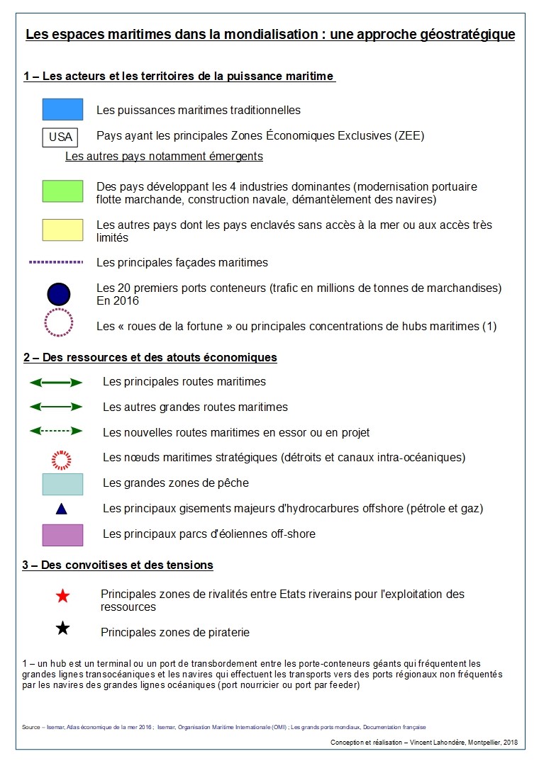 Pour ce qui concerne les ressources et atouts économiques, il a fallu hiérarchiser les routes maritimes (principales routes, autres routes) sans négliger l’avenir (nouvelles routes maritimes en projet ou en essor), et tenir compte d’autre part des principales ressources qu’offrent la mer (activités traditionnelles autour des zones de pêche, principaux gisements d’hydrocarbures, activités en devenir autour des parcs éoliens). On aurait pu aussi ajouter les aspects touristiques (zones de croisières, façades touristiques majeures…), mais encore une fois les impératifs de lisibilité mais aussi pédagogique ont dû l’emporter.