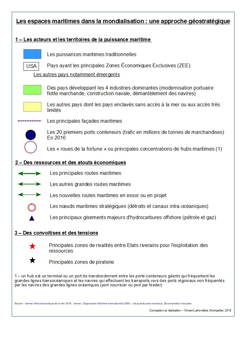 Les pays qui possèdent les flottes militaires les plus étoffées et (ou) les plus réactives face à un éventuel danger (guerre, piraterie…) ; les pays ayant les principales Zones Economiques Exclusives (ZES) ; les pays développant les industries dominantes dans le domaine maritime (flotte marchande, construction navale, démantèlement des navires, modernisation portuaire).