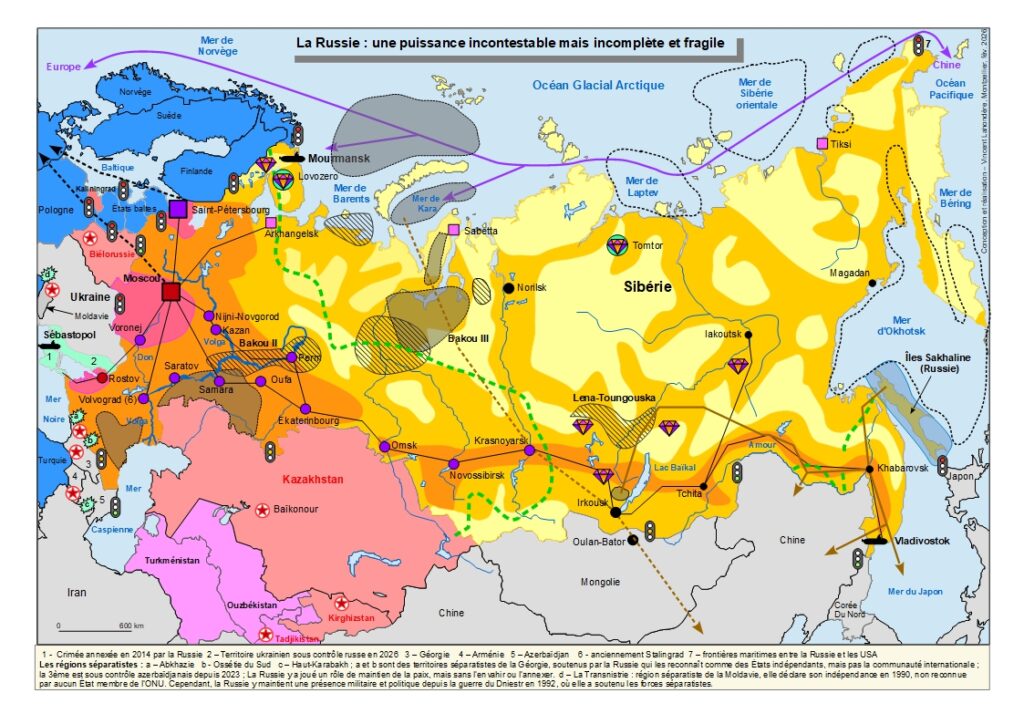 Cette carte intitulée « La Russie : une puissance incontestable mais incomplète et fragile » met en évidence les fondements, les formes et les limites de la puissance russe à l’échelle continentale et mondiale. Elle montre que la Russie dispose d’atouts majeurs, mais qu’elle reste confrontée à de fortes fragilités structurelles.