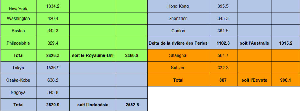 Si l’on examine maintenant la richesse produite par quelques grandes mégalopoles mondiales (tableau ci-dessous), on s’aperçoit que certaines d’entre elles sont au niveau de certains états : une partie de la Mégalopolis (Baltimore et d’autres villes moins importantes ne sont pas prises en compte) génère par exemple autant de richesses que le Royaume-Uni, le Delta de la rivière des Perles autant que l’Australie. Les grandes mégalopoles concentrent les richesses : la localisation (bord ou proximité du littoral), le capital humain, la connectivité et l’attractivité jouant ici un rôle essentiel.